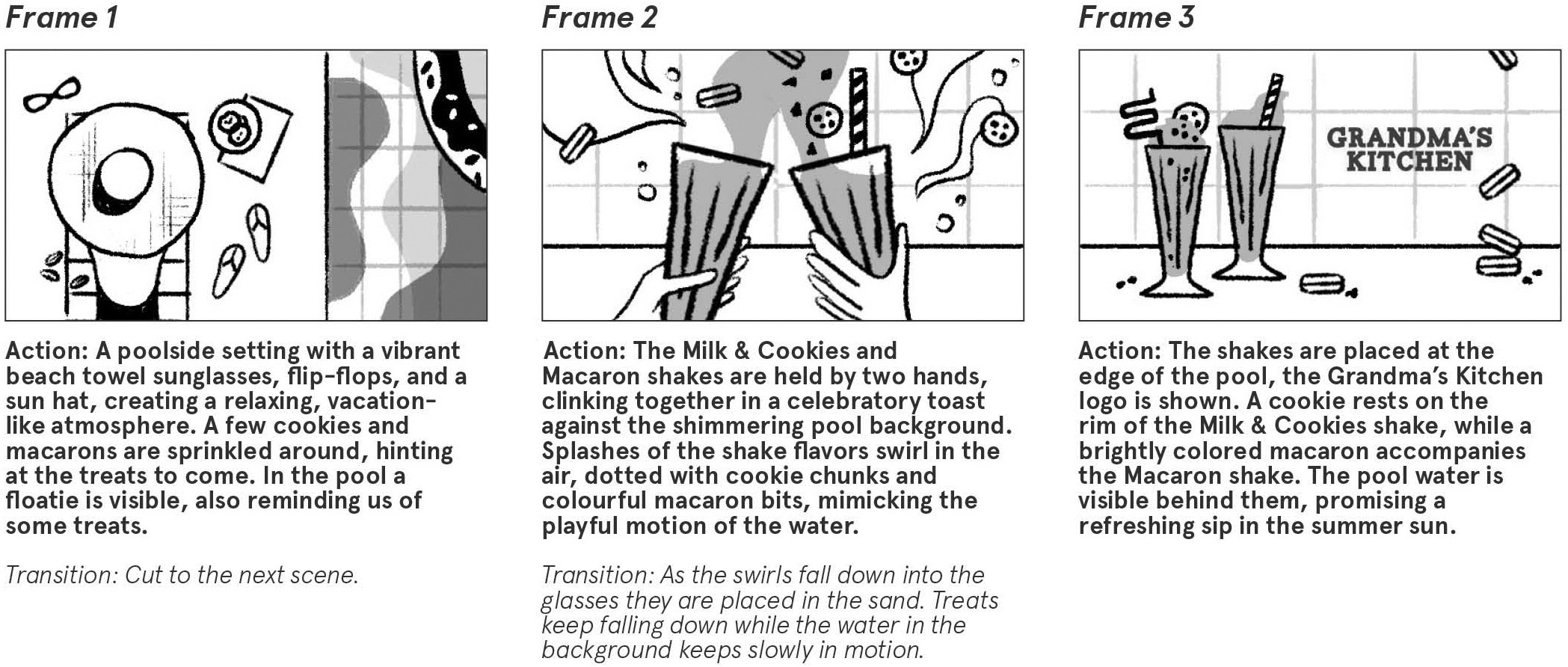 I came up with a concept called "poolside paradise", which adds a fun, summery twist to the story in reference to the release date. The three frames I created should be visually compelling yet not overly complex, to ensure that the shakes remain the star fo the story and the animation can be smoothly executed. I imagine this piece to be a and-drawn cel animation, getting done in Adobe After Effects.