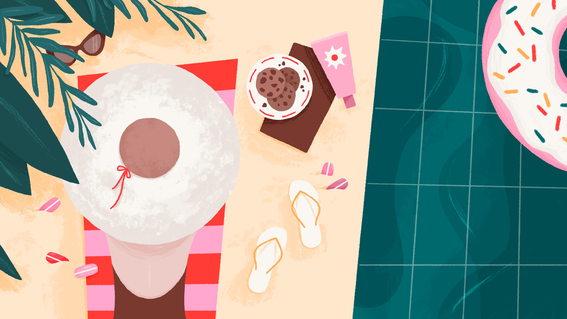 I played around with proportion, distortion and contrasts in shape and scale using lighting/shading and big chunky textures for a 3D effect. Throughout the piece you can find the main ingredients of the shakes in addition to lots of summery elements like sunglasses, a floatie and sunscreen. To create a feeling of depth I used different reoccurring overlaying elements. I went with a very summery and warm colour palette completed by a cooler greenish tone to emphasize the mood I wanted to create.