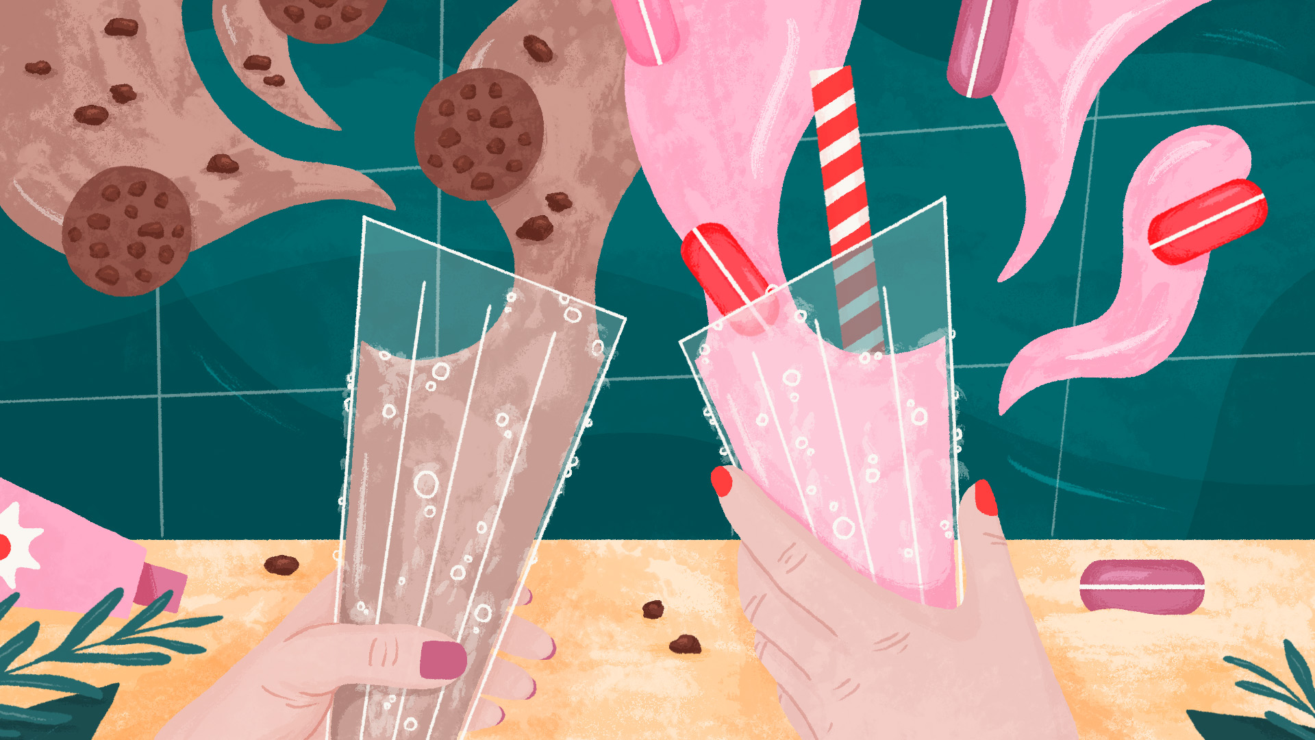 As we had complete freedom on how we wanted to showcase the flavours and present the story I started by brainstorming, creating a moodboard an sketching some ideas. The flavours I chose to promote are "Grandma’s Milk & Cookies" and "Marvelous Macaron". My focus was on conveying the feeling of satisfaction and fun in addition to showcasing that you can drink the shakes anywhere you want. I also kept in mind that the brand is colorful, adventurous, organic, and homemade and not afraind of fun, wild flavours.