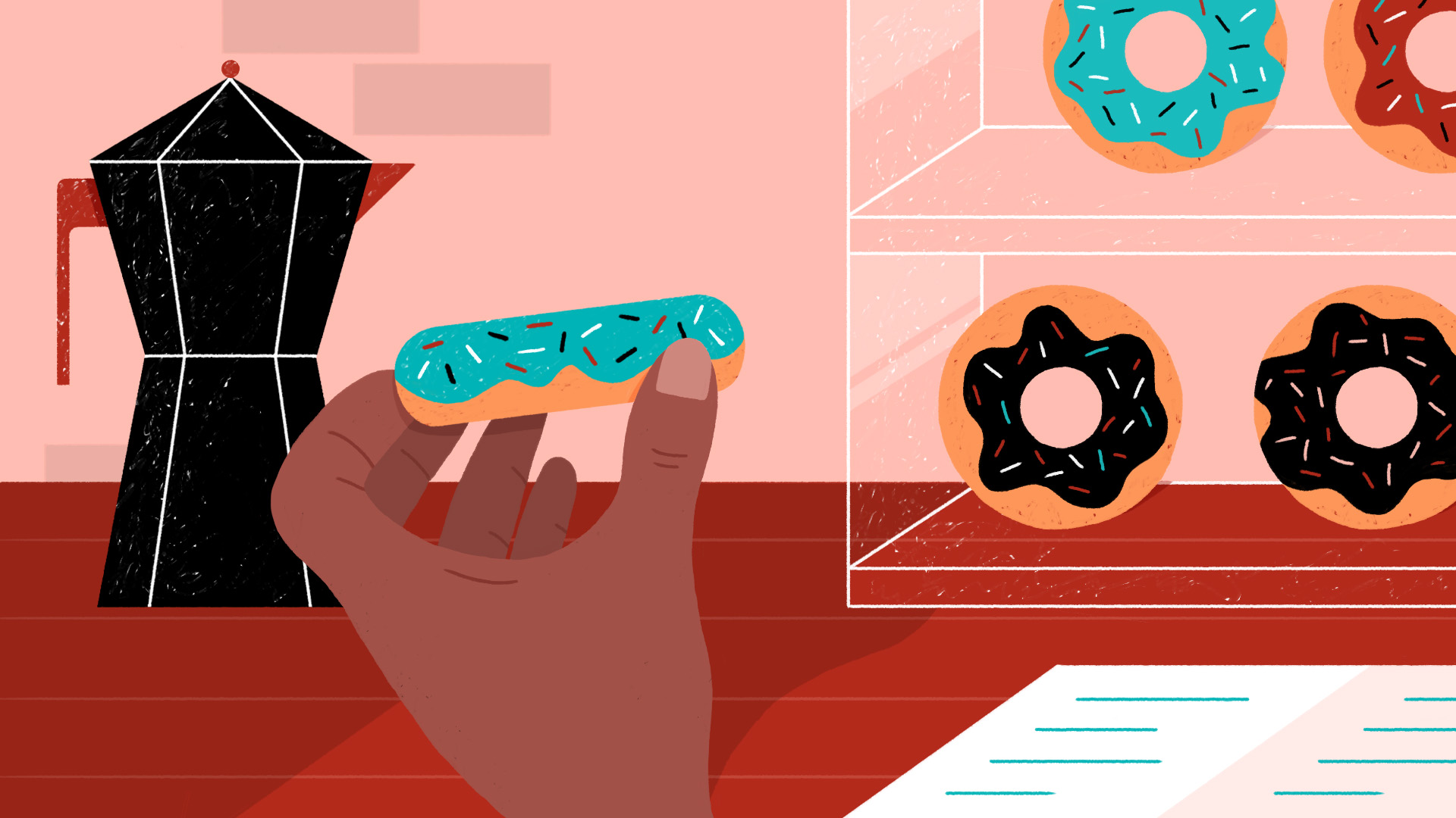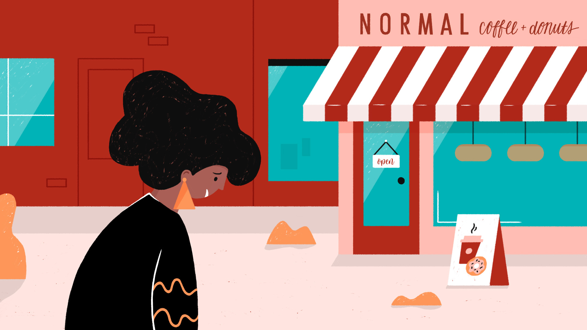 I imagine this promotional video to relatably share the experience of our main character from feeling down to getting very energized by picking up products from "Normal Coffee". The mood should go from draggy to very energetic and lighthearted. The main character and the surroundings will be brought to life through hand-drawn cel animation, animated in Adobe After Effects. At the end of the spot another little playfully animated character will be shown on the coffee cup to reinforce the happy and energetic feeling that customers should get after buying coffee and donuts at the boutique shop.